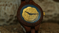 Set into durable oak wood, the watch merges historical significance with artisanal craftsmanship. Oak’s natural grain enhances the coin’s visual appeal, creating a timepiece that is both elegant and historically significant.