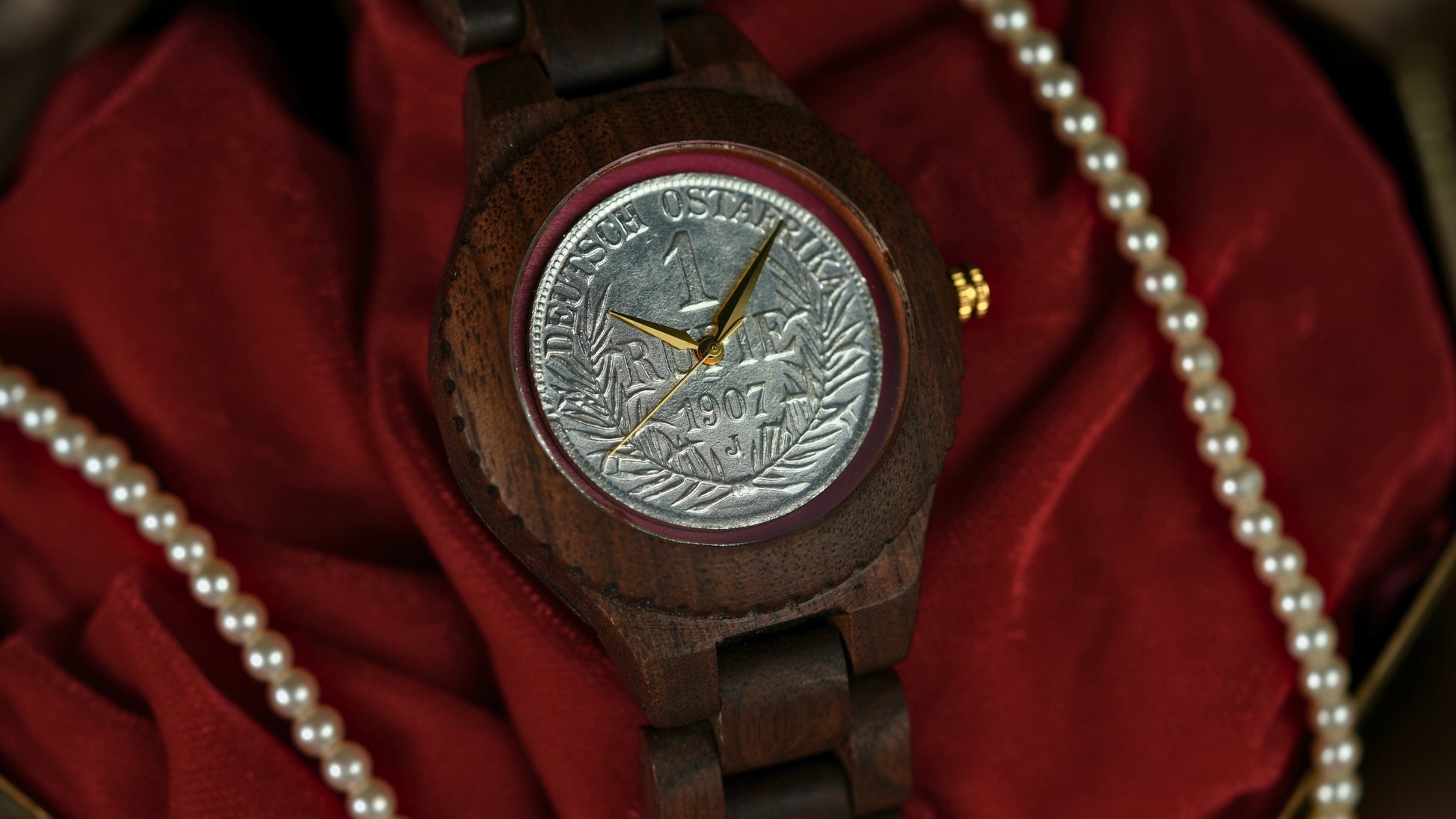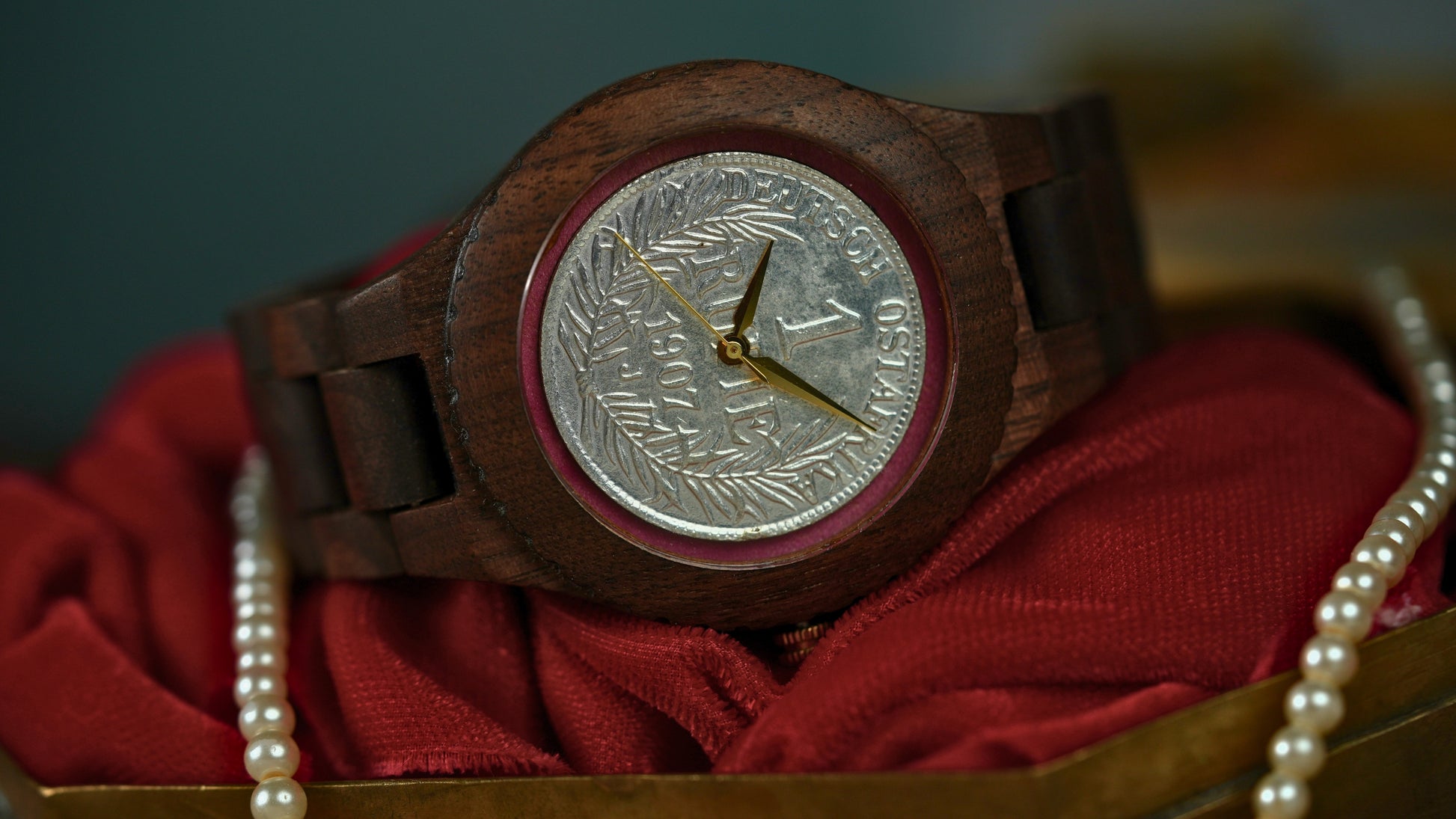 Handcrafted into rare oak wood, the watch integrates the coin seamlessly, preserving both its historical significance and aesthetic appeal. The oak’s natural grain enhances the Silver’s shine, creating a timeless accessory that transcends ordinary watch design.