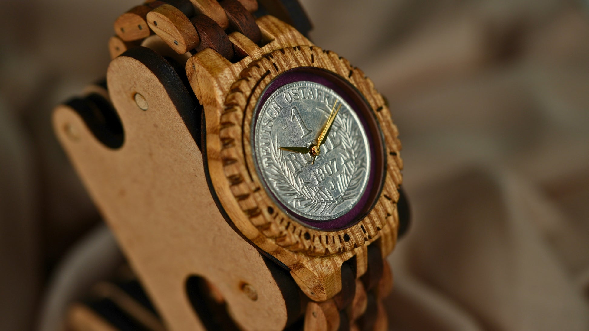 Hand-set into oak wood, the coin forms the focal point of a luxurious timepiece. The natural grain of oak enhances the metallic sheen, creating a wearable artifact that combines history with craftsmanship.